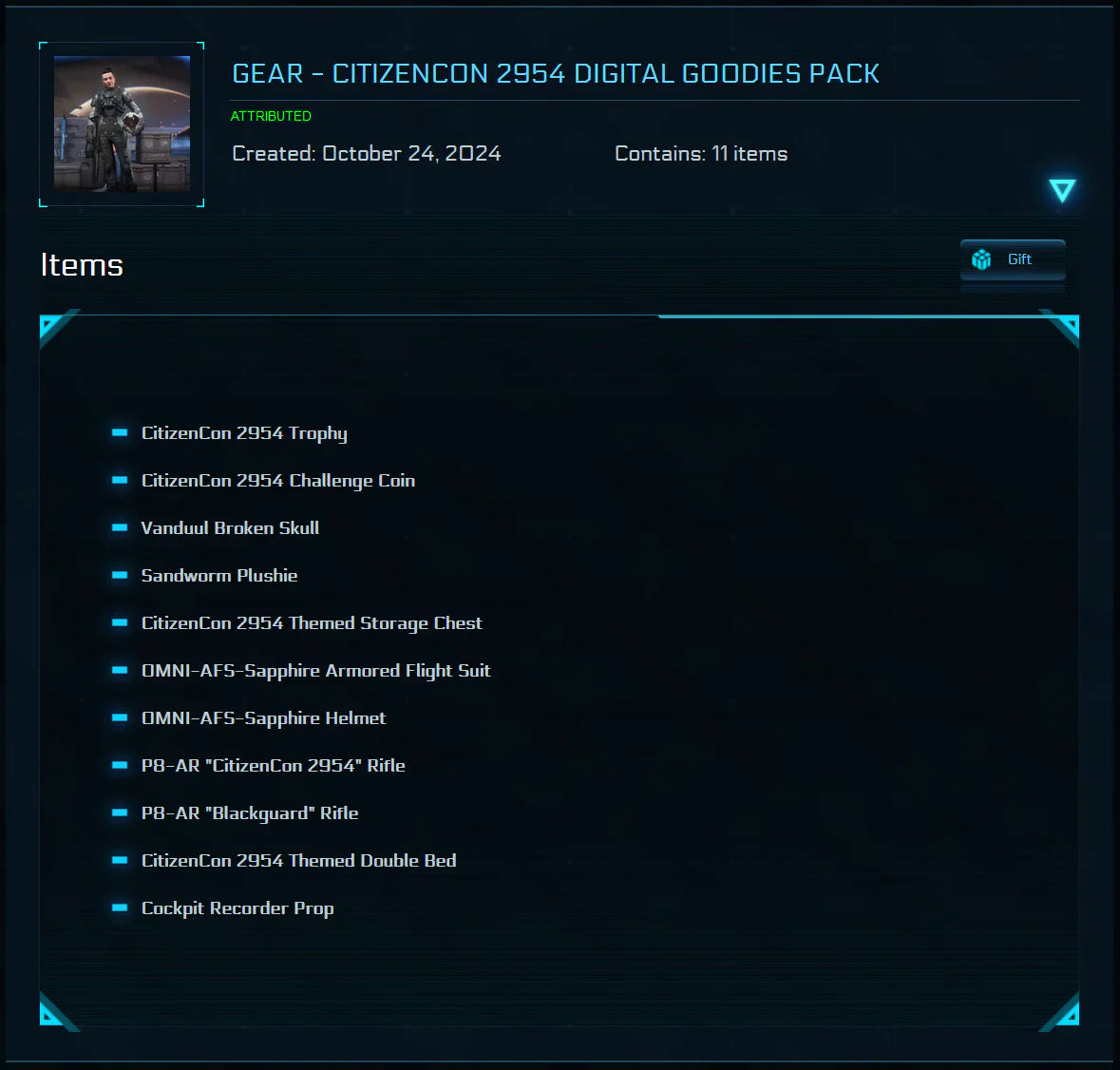 The CitizenCon Goodies Pack is an exclusive and rare item bundle originally available for purchase during the 2954 CitizenCon event. It includes the following highly sought-after in-game items: