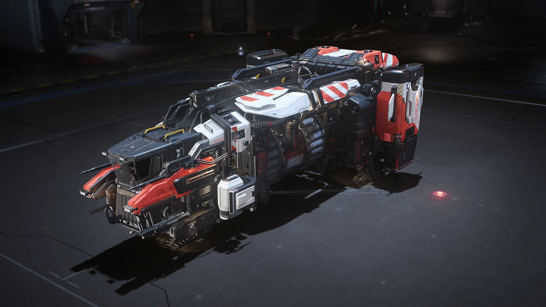 Prominent use of orange offset against white makes the Drake Golem Flashpoint livery highly visible on busy and dangerous work sites, only available to members of the Chairman’s Club.